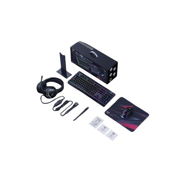 El Onikuma TZ5008 es uno de los combos más completos del mercado, diseñado para quienes quieren transformar su escritorio en una verdadera estación de combate de una sola vez. A diferencia de otros kits, este es un 5-en-1, lo que significa que incluye absolutamente todo lo necesario para jugar, comunicarte y organizar tu setup con una estética unificada.